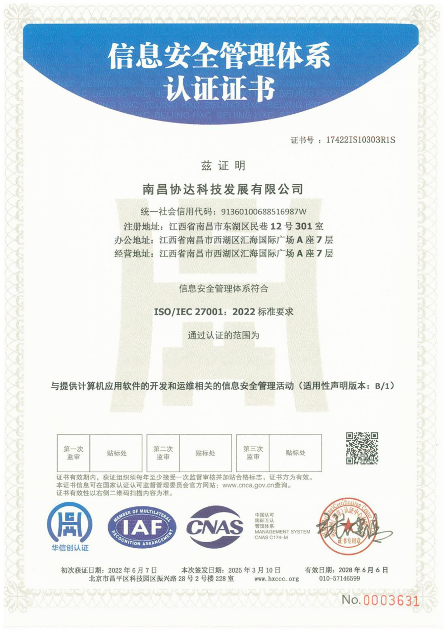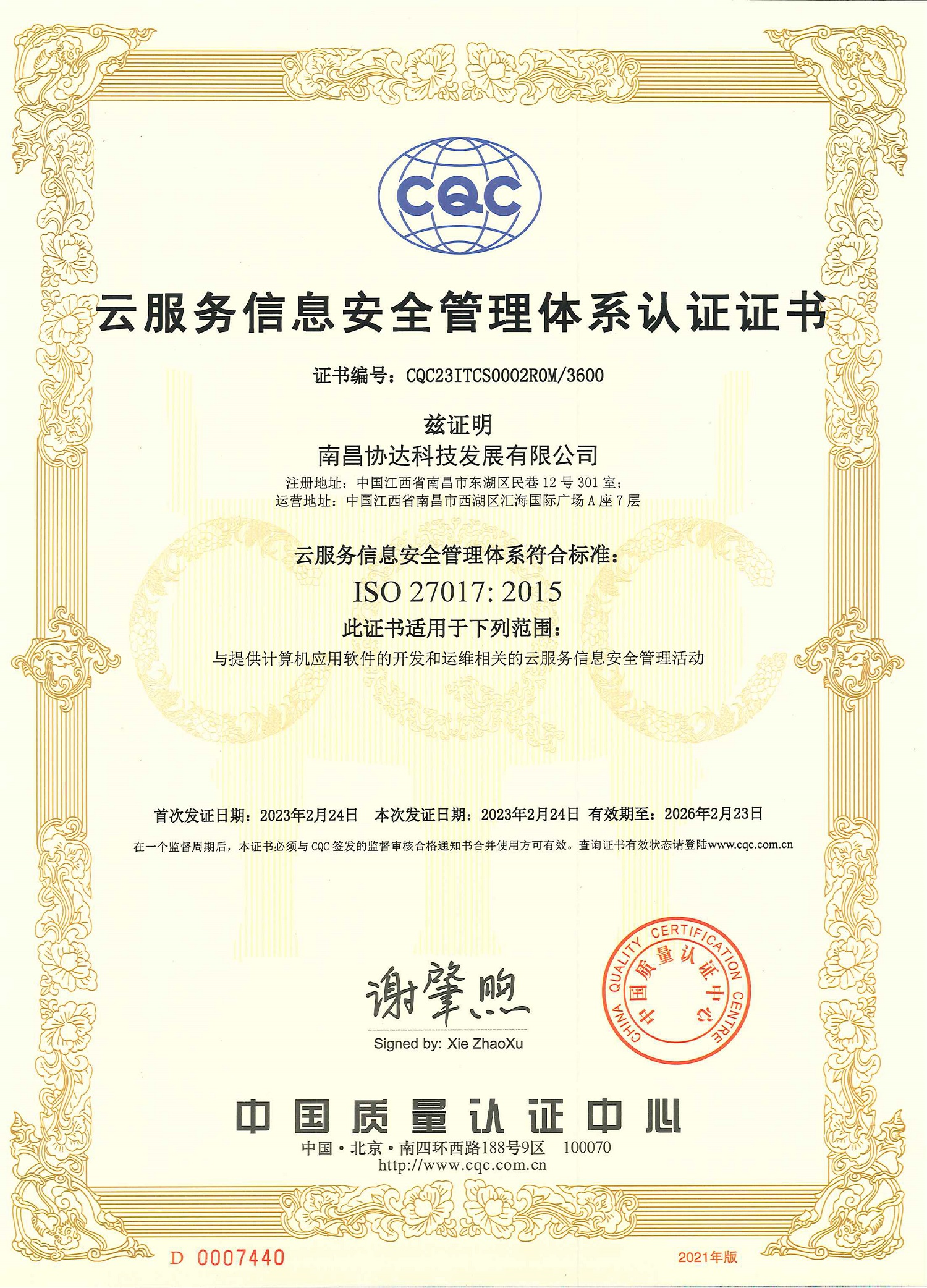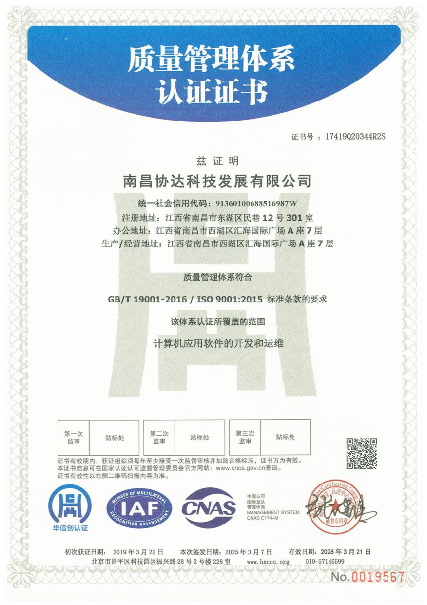 協(xié)達科技成立于2009年5月,憑借高端的軟件研發(fā)技術(shù)及先進的管理理念順利通過保密資質(zhì)、國家高新技術(shù)企業(yè)資質(zhì)認定及江西省“專精特新”中小企業(yè)資質(zhì)認定,先后獲得CMMI3級證書、ITSS運維服務(wù)、CCRC軟件安全開發(fā)、ISO27017、ISO27001及三體系認證證書等。