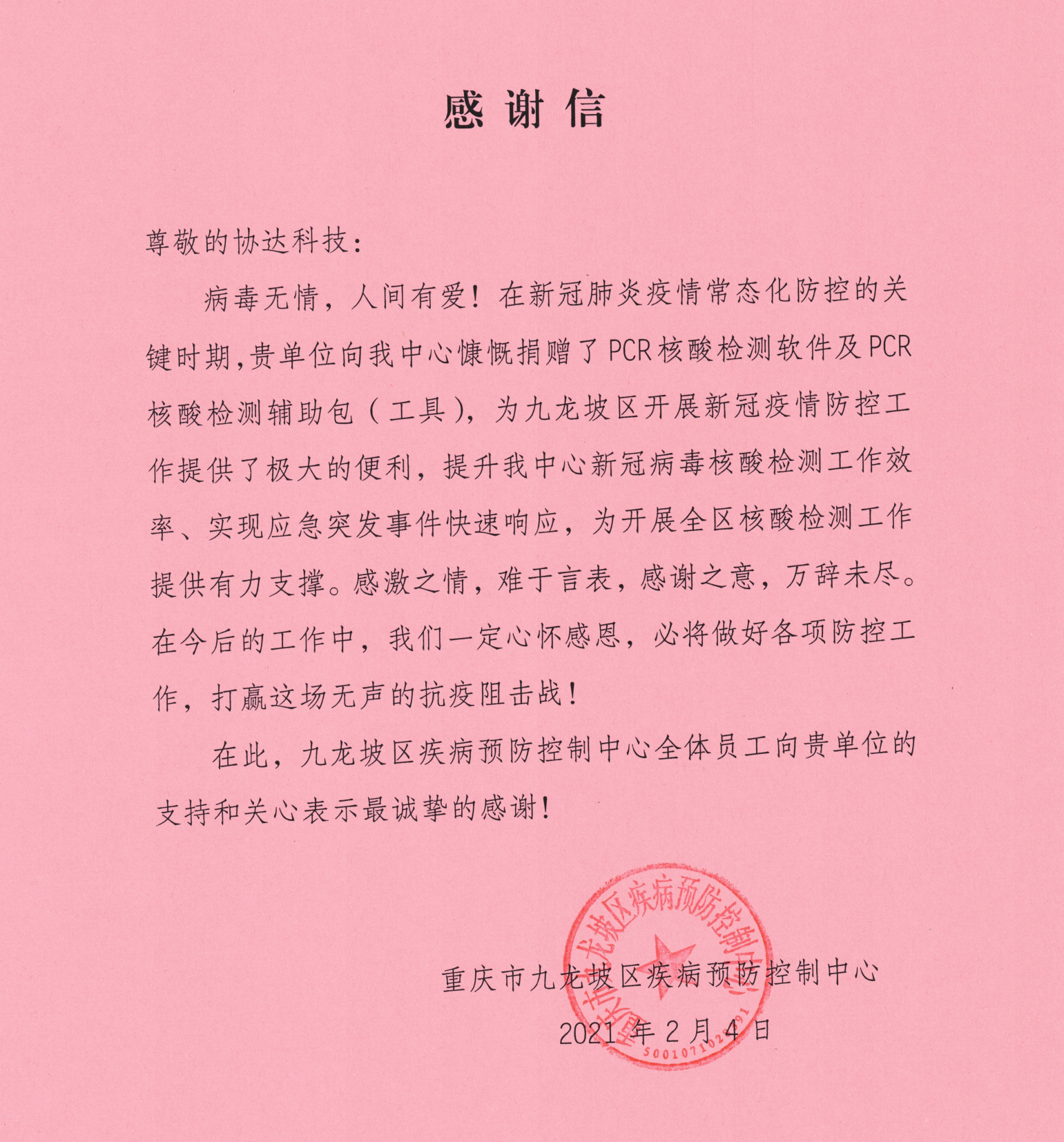 在小年夜,我公司收到重慶市九龍坡區(qū)疾控中心的感謝信,在雙方戰(zhàn)略合作伙伴關(guān)系下,我公司為中心疫情防控盡一份綿薄之力,同時(shí)履行公司的社會(huì)責(zé)任,最后,感謝中心的信任和支持,我公司將全力配合支持中心在疫情防控中相關(guān)的工作。
